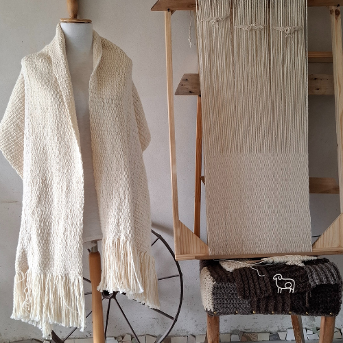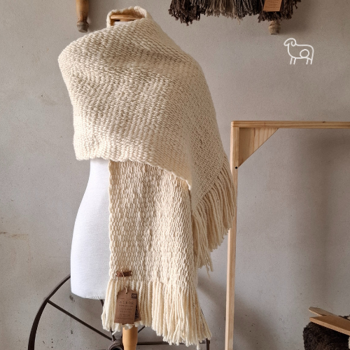 Pashmina tejida en telar bastidor utilizando lana merino patagónica, suave, cálida y natural. Disponible en color gris.